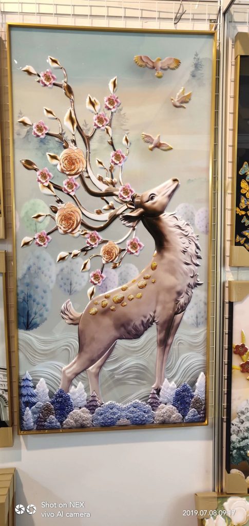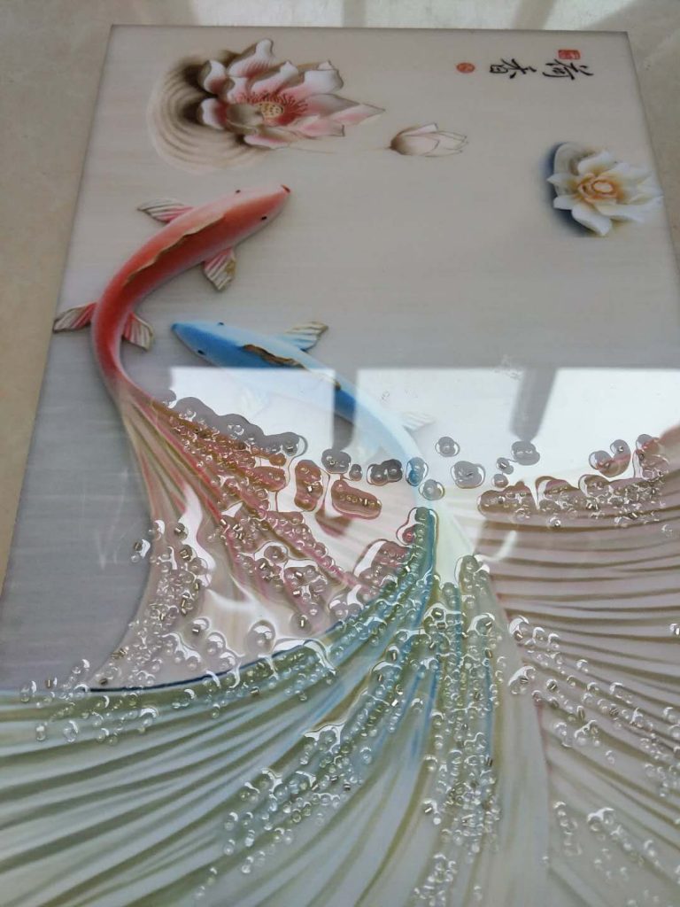 晶瓷畫是新創造的名稱,其工藝很新穎,表面光亮,似瓷似晶。晶瓷畫是采用優等密度板配合優等水晶材料,利用弘益機械設備的烤瓷機,使畫和水晶材料渾然一體后,跟密度板致密結合。其實這種表面烤瓷并不高檔,應該結合陰刻、貼箔、鑲嵌、手繪,成畫后再在表面涂層,或者稱為復一層晶瓷,這樣的畫才會顯得輕奢和高級。